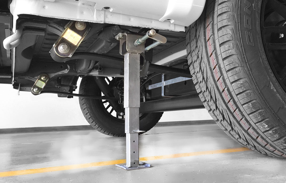 Die im Lieferumfang serienmäßig enthaltene Kurbel wird auf die Antriebswelle des MoCa-Systems gesteckt. Mit der ersten Umdrehung stellt sich die am Fahrzeug anliegende Klappstütze in die senkrechte Stützposition. Weitere Kurbelbewegungen lassen die Stütze manuell ausfahren. Über das steckbare Teleskopsystem ist eine Längenanpassung der Stütze um bis zu 90 Millimeter möglich. Wird das Fahrzeug trotz ausgefahrener Stützen bewegt, klappen diese nach hinten weg, ohne dass eine Beschädigung am Fahrzeug verursacht wird.