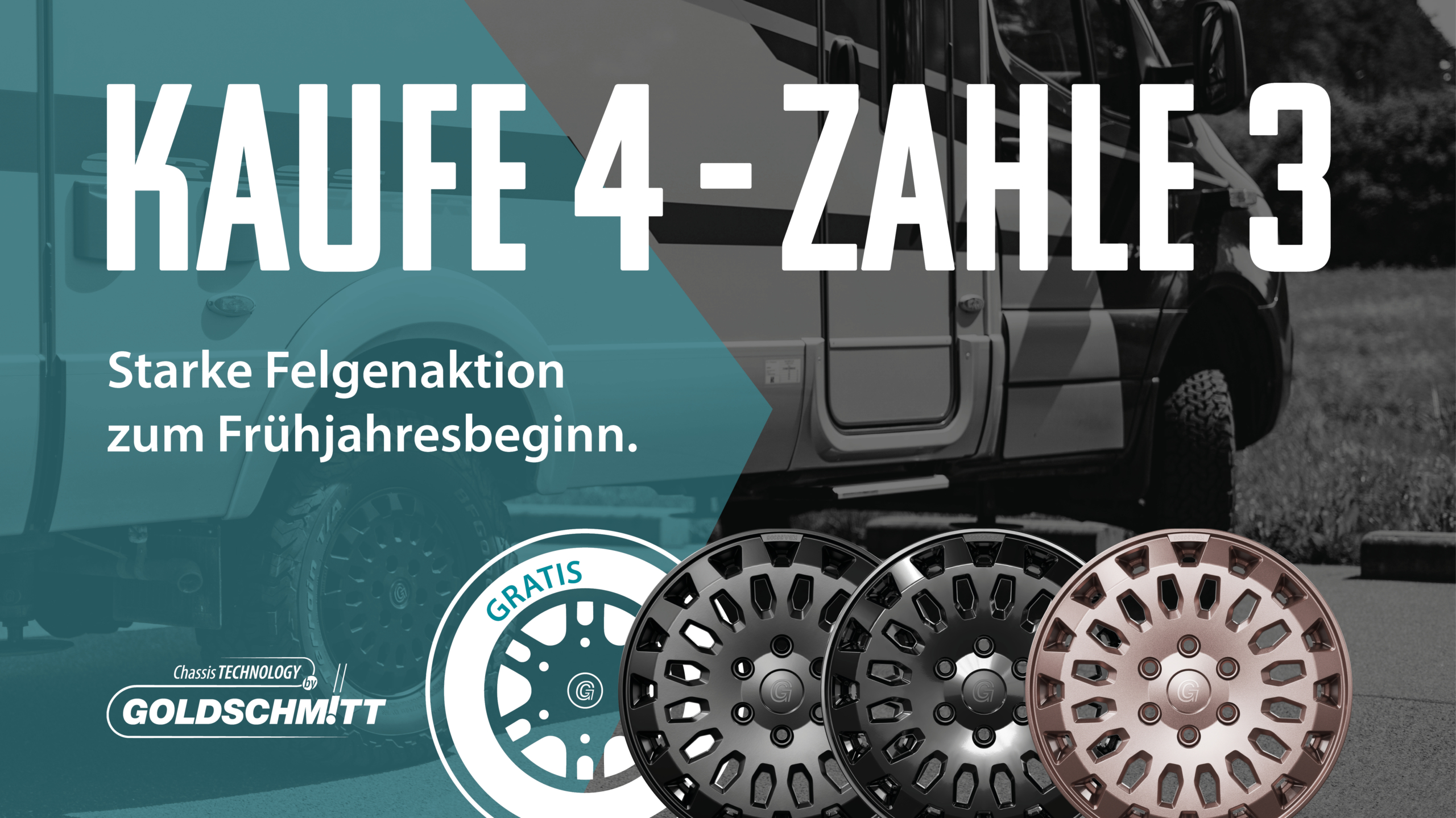 Beim Kauf von vier GSM20‑Felgen zahlen Sie bis Ende April nur drei. Damit bieten wir Ihnen die ideale Gelegenheit, Ihr Reisemobil sowohl technisch als auch optisch aufzuwerten. Die GSM20 überzeugt mit ihrem markanten 4×4‑Look und verleiht Ihrem Fahrzeug ein kraftvolles Erscheinungsbild. Gleichzeitig profitieren Sie von einer besonders hohen Traglast, welche die ideale Grundlage für eine Auflastung bildet und Ihnen zusätzliche Reserven für Gepäck, Ausrüstung oder Zubehör bietet. Nutzen Sie jetzt die Gelegenheit, Ihr Reisemobil für die kommenden Reisen fit zu machen und dabei bis zum 30.04.2026 von einem besonders attraktiven Preisvorteil zu profitieren.